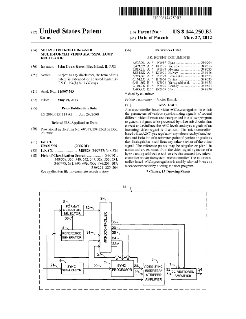 I have a proven ability to custom design electronic circuits. The most complex and successful example is that of United States Patent Number 8,144,250 B2 entitled "Microcontroller-Based Multi-Format Video AGC/Sync Loop Regulator." A link for viewing this patent is provided in the right page section. This patent is a pro se document that was written and legally prosecuted by me in its entirety. The circuitry was designed and tested in my personal electronics lab in my home. The circuit is designed to stabilize the AGC and horizontal sync portions of the vertical blanking interval (VBI) and the horizontal blanking interval (HBI). It can also be used to modify the data that is contained in certain portions of the VBI. This modification is accomplished by the program written into the on-board microcontroller.